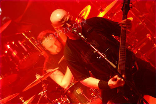 Mais avant ces réjouissances, place à CEPHALIC CARNAGE. Ils ne sont pas là pour rien, car en dehors de nous asséner leur Death barbare, on aura le privilège d'entendre deux chansons de l'album à venir Xenosapien. Que du bon en prévision! Pour ce qui est du show, je suis franchement déçu par contre. Si les musiciens apparaissent complètement déjantés et forts d'un jeu de scène Grind comme il faut, la rigueur n'est pas de mise. Beaucoup de chansons sont brouillonnes, manquent de clarté... Ou est passé la précision et la froideur chirurgicale que j'ai pu entendre sur Anomalies? Bref, je n'ai pas du être le seul à penser en ces termes, car certains sont allé chercher un peu de répit dans les fauteuils avant le final de cette soirée.
