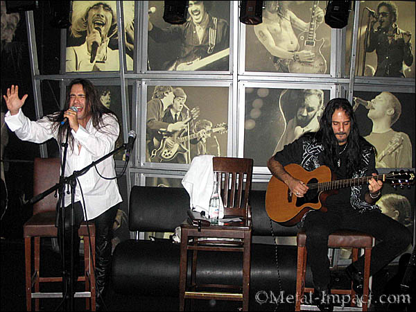 Andre débarque donc vers 20h30 au HRC, accompagné de son guitariste Andre "Zaza" Hernandez, le plus simplement du monde. Les deux compères montent sur les planches 45 mn plus tard, et se lancent dans un "showcase" qui ne peut être qu'à leur image : poétique, communicatif, énergique, passionné. Si le set démarre doucement avec quelques extraits du Holy Land d'ANGRA ("Make Believe", "Holy Land"), le Metal même acoustique qu'affectionnent les deux Andre ne tarde pas à pointer le bout de son nez, avec notamment une reprise de VIPER ("Living For The Night") et un premier extrait du nouvel opus, "Rio". Le père Hernandez s'en sort rudement bien à la gratte, alternant arpèges, rythmes sud-américains et accords plus folks. Il y va même de sa petite démonstration technique pendant qu'Andre fait une pause en plein milieu de "Letting Go" (titre d'ouverture de Time To Be Free). A l'écoute de ce petit interlude, on comprend que c'est bien la richesse de leur culture musicale qui a rapproché les deux musiciens (rappelons qu'Hernandes fut le premier six-cordiste d'ANGRA).