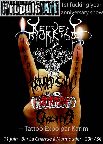 Reprenant la bonne vieille formule des Guignols de l’Info, on pourra clamer haut et fort en l’honneur de l’association Propuls’Art : « Putain, 1 an ! ». Et de rajouter : « déjà… ». Car oui, pour sa première année d’activité, Propuls’Art n’a pas vu le temps passer. Toujours à l’affut d’un concert à organiser ou d’une soirée à houblonner, cette association a réussi l’exploit de se faire une sympathique réputation dans le Grand-Est français (Alsace / Lorraine). Il n’est d’ailleurs plus très étonnant de retrouver leur blaze sur les flyers des soirées underground alsaciennes. Car Propuls’Art, c’est avant tout l’amour. L’amour des fesses hirsutes, de la bière et du Metal. Une flamme authentique qui habite ses membres et son président qui n’ont de cesse de nous surprendre, concert après concert. Après avoir fait jouer des groupes comme APOCRYPHE, ETHROPIA, MALARIAH ou encore FRAKTUR, Propuls’Art fera son entrée dans la cour des grands en ce 11 juin 2010. La tête d’affiche vous sera probablement plus familière que les différents noms cités dans la phrase précédente. Et pour cause, c’est un des grands représentants du Death Metal tricolore qui a fait les bornes nécessaires pour rejoindre le désormais illustre bar La Charrue de Marmoutier afin de poursuivre leur éternel combat, selon le nom de leur dernier album. Je parle ici des francs-comtois de RECUEIL MORBIDE. C’est un signe qui ne trompe pas, Propuls’Art commence à prendre du galon dans le milieu. Pour le plus grand bonheur des amateurs de gros Metal qui tâche. Car en plus d’être chapeautée par une figure incontournable du Death français, cette petite fête d’anniversaire s’annonce foutrement brutale (et elle le sera, dans tous les sens du terme) avec la présence de TAENYA, AGON, TORTURED SOUL et autre CADAVERIC HUNTER. Autrement dit, on reste en Alsace. Mais surtout, on reste dans un registre Death / Grind violent et sans compromis.