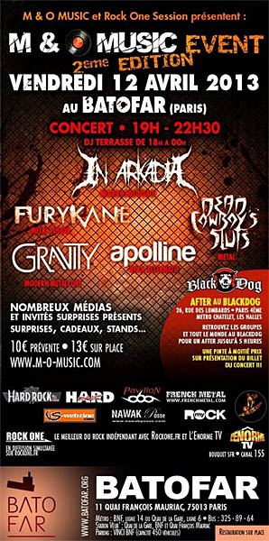 Groupes Présents au concert : DEAD COWBOY'S SLUTS (FRA), GRAVITY (FRA), APOLLINE (FRA), FURYKANE (FRA), IN ARKADIA (FRA)