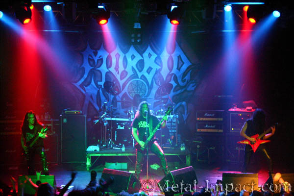 L’affiche est réduite à deux groupes ce soir (ce qui n’est pas plus mal) donc c’est déjà au tour de MORBID ANGEL d’envoyer la sauce. Et dès l’intro, une bonne surprise puisqu’ils débarquent sur le génial "Day Of Suffering" de l’album "Blessed Are The Sick" ! Jolie mise en bouche, mais on déplore très rapidement la qualité du son, identique à celle de Krisiun donc très en deçà de ce à quoi on aurait pu s’attendre, ce qui va gâcher une partie du plaisir. Il n’y a que les excellents solos - aussi torturés qu’inspirés - de Trey Azagthoth qui ressortent vraiment bien. Le guitariste possède la classe des grands même si, à l’image de tout le reste du groupe, son jeu de scène est minimaliste. Reste qu’à part le très discret second guitariste – qui m’a fait regretter au plus haut point de ne jamais avoir vu le groupe avec son incroyable prédécesseur Erik Rutan – les musiciens ont une présence naturelle qui assure l’essentiel. Pete Sandoval, le batteur, est carré, précis et très puissant, et Steve Tucker, le bassiste chanteur, assure toutes ses parties avec brio, et a une voix monstrueuse bien comme il faut ! Enfin parlons de la set-list, qui m’aura largement contenté, même si j’aurais vraiment aimé que le groupe reste plus longtemps (un peu plus d’une heure seulement… Franchement pousser au moins jusqu’à l’heure et demie n’aurait pas été du luxe pour un si grand groupe !!). Ils ont passé en revue toute leur discographie, ce qui a donné des morceaux variés à souhait, avec notamment pas mal du dernier album bien sûr (quatre ou cinq morceaux qui m’ont laissé pour la plupart une très bonne impression). Mais aussi deux ou trois extraits de "Formulas Fatal" (que je ne saurais vous nommer), au moins deux de "Covenant" (ouch c’était bon ça, avec notamment le destructeur "Rapture" et le lourdissimo-génial "God Of Emptiness"), deux de "Altars" s’ils vous plaît ("Chapel Of Ghouls" en dessert !!), et – snif - seulement deux incursions du côté de mes deux albums préférés, "Gateways" et "Domination", mais quels morceaux : respectivement "Ageless, Still I Am" et, top du top du top pour moi, le vicieux et démentiel "Where The Slime Lives" pendant lequel je me suis un peu senti m’envoler au septième ciel... Voilà, je crois que je n’ai rien oublié ! Nom dé diou que ce fut bon !!!! (note: 9/10)