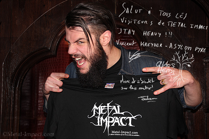 Vincent. A la rigueur tu vois, je dirais que je n’avais pas le trac, je savais qu’on allait faire le show même si les conditions étaient hyper strictes, installation et balance en dix minutes ce n’est pas facile. J’avais moins peur pour ça que pour l’accueil du public parce que les fans de DORO, ils sont branchés Hard Rock. C’est une musique qui a une esthétique avec des codes stricts. Ce n’est pas le public le plus ouvert de la planète et surtout on n’était annoncés nulle part. Ils s’en foutaient royalement de nous, personne n’était venu pour ASYLUM PYRE. Ils avaient envie de voir DORO et nous on emprunte à d’autres styles que le Hard Rock même si on a des teintes qui vont dans ce sens. J’avais très peur à ce niveau là, on a attaqué alors que le Divan Du Monde était un quart plein et on a fini la salle était blindée à craquer. On a passé la soirée à signer des autographes, à faire des photos et à vendre du merchandising. Il y a plein de gens qui sont venus nous voir pour nous dire que maintenant ils nous suivaient. On a eu beaucoup de compliments du genre : « On vous a trouvé génial et on va venir vous voir sur d’autres dates ». L’accueil du public sur les shows qu’on a donné récemment est bon, ça fait super plaisir et on est très heureux. Mais là dans un contexte où personne n’était venu pour nous mais pour voir une entité : DORO qui est très représentative d’une certaine école, ce n’était vraiment pas gagné. Au final ça s’est super bien passé et on était soulagés.