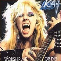 Elle s’inventa alors un personnage, excessif lui aussi, de reine de la guitare hystérique, maniant aussi bien (selon ses dires, et donc parfaitement) le médiator que l’archer, le tout sans état d’âme, et pétrie de certitudes. Au départ, l’album sorti en 1987, Worship Me Or Die, n’attira pas les foules. Il intrigua bien sur un petit noyau de Thrasheurs purs et durs, et attira l’attention d’une poignée de magazines à l’affût, mais il fallut attendre les interviews de Katherine pour que celui ci explose vraiment.