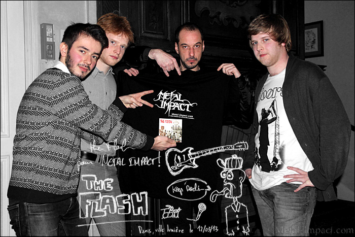 THE FLASH est le nouvel ovni qui sévit sur la France depuis ce début d'année. Formé en 2008 par les frères Thomas (guitare) et Simon (batterie), c'est à l'occasion d'un repas bien arrosé qu'ils découvrent la voix remarquable d'Elise -une amie de longue date- et décide de monter un combo officiant dans une Pop Rock agrémentée de guitares Hard des plus efficaces. Nos lascars issus de Longwy dans le Nord Est de la France vont très vite s'adjoindre les services de Lucas à la guitare solo. L'arrivée de Fab à la basse sera déterminante pour la suite des événements, le bougre grâce à son expérience acquise au sein de diverses formations va entraîner le gang vers un avenir des plus radieux. Exit les concerts dans les petites fêtes locales ou les lycées ! Nos petits gars du Nord vont mettre les bouchées doubles afin de pouvoir s'imposer dans un premier temps sur la scène locale pour sévir au niveau national le plus rapidement possible. Dès lors, nos amis feront de nombreuses répétitions histoire de peaufiner les morceaux ! Leur premier concert aura lieu en 2009 et sera une excellente surprise puisque le show sera sold out sans qu'aucune promotion digne de ce nom soit faite. Un exploit qui leur donnera confiance pour la suite des évènements. Car à partir de cet instant, la machine est lancée à toute vapeur et ne va plus s'arrêter. Les kids du Nord vont enchaîner les dates à un rythme effrayant s'offrant même le luxe d'une tournée en Irlande, une vraie Rock attitude qui va porter très rapidement ses fruits. La rencontre avec Michel Ruer sera fondamentale, le bougre identifiant immédiatement tout le potentiel de THE FLASH va permettre au combo d'enregistrer sous la houlette de Yann Klimezyk un mini cd 5 titres qui va être déterminant pour la suite de l'aventure. Peu de temps après, nos Longoviciens sont remarqués par Eric Coubard qui les signe immédiatement sur son Label Bad Reputation. Le gang rentre très vite en studio sous la houlette de Jim Diamond (WHITE STRIPES, LOVE ME NOTS) pour enregistrer leur premier méfait qui s'avère être une totale réussite, un must dans le style. Aucun doute n'est permis, on tient là du très bon voir de l'exceptionnel. Mené par Elise, chanteuse doté d'une voix envoûtante et originale, chaque titre est un hit en puissance à la fois mélodique et captivant. Il suffit d'ailleurs d'écouter le single "Soul Alone" pour être convaincu des capacités incroyables de nos ch'tis ! Face à une telle pépite, MI se devait d'en savoir plus sur ces lascars venus du Nord ! Votre fidèle serviteur n'hésita pas à braver les intempéries et traverser un Paris couvert de neige afin de soumettre à la question le groupe réuni au grand complet au coeur d'un Pigalle méconnaissable ! Rencontre sympathique avec des musiciens visiblement heureux d'être à Paris pour parler de leur progéniture. Magnéto les gars, c'est à vous !
