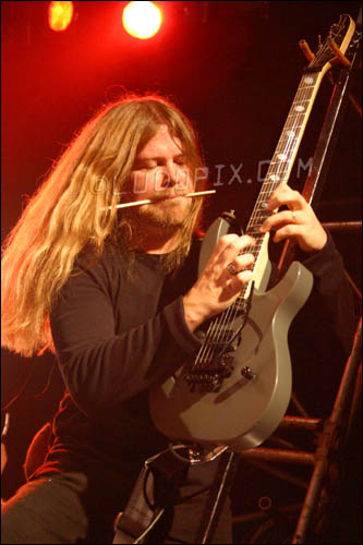 Le set commence par des titres récents (après "Rape of the earth" quoi), et même si je ne les connais pas tous, rien à foutre, j'ai les yeux et les oreilles rivés sur le manche de Rondat, avec ses petits doigts qui allient rapidité, feeling, toucher, et ultra technique! C'est le seul gratteux instrumental (avec Satriani dans ses bons jours) qui ne m'emmerde pas pendant plus d'une heure de show! Ce mec il est timide, il bouge pas énormément, il se secoue pas les poils, mais il joue juste et me fait vibrer par ses harmonies, son alternance de toutes les techniques solistes, ses mélodies, sa recherche de mettre en place une "vraie chanson" et pas seulement une branlette de manche genre shredder. Patrick Rondat écrit des chansons. Voila ce que j'aime le plus chez lui.